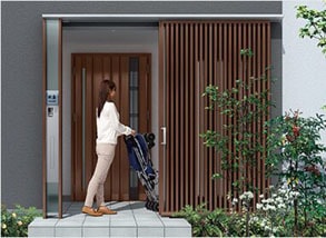 玄関と門の“ダブルエントランス”で、外への子どもの飛び出しを防止。新しい空間に収納も可能。