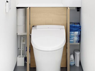 掃除道具や予備のペーパーなど、すぐ取り出しやすいトイレまわりに収納できます。